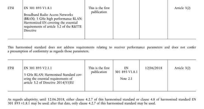 刚刚接到来自欧盟的最新公报,EN301893V2.1.1版本的法规于2017年6月8日正式OJ;其中,关于设备自适应测试的部分有这样的规定,在2018年6月12日之前, 1.8.1版本的和2.1.1版本的均可以正常使用,在该日期之后,就只能接受2.1.1版本的自适应测试标准;