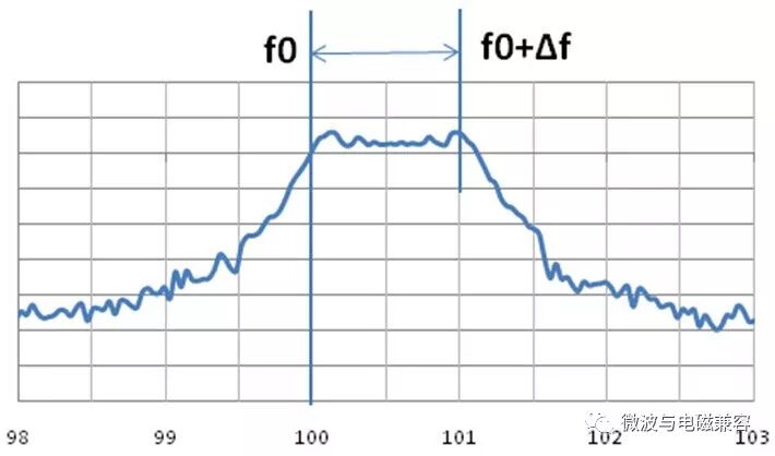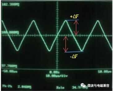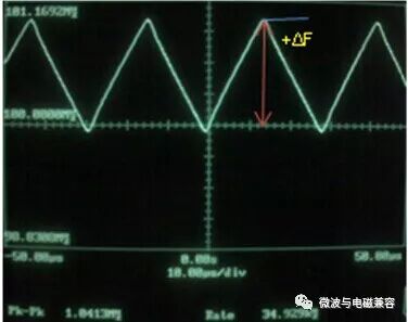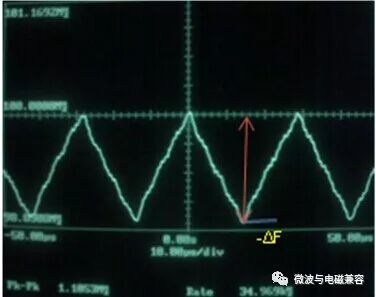 图9. 中间展频(Spectrum Analyzer Plot) 2. 向下展频 向下展频(Down Spread)是指展频时钟的最高频率等于源时钟频率的展频方式。在未调制时钟输出频率等于输入时钟频率的系统中,展频后输出时钟频率 fo 按调频方式(Linear或Hershey Kiss)决定的波形以MR速度,在(fc-Δf)到 fc 范围内变化,即: fo = fc - Δf 例如,100MHz时钟以-1%调制深度向下展频后,输出时钟的变化范围为99MHz~100MHz。 图10和图11表示这种展频模式的特点,其中图10表示输出时钟频率 fo 随时间变化的情况,图11表示幅度(能量)在频率范围内分布的情况。