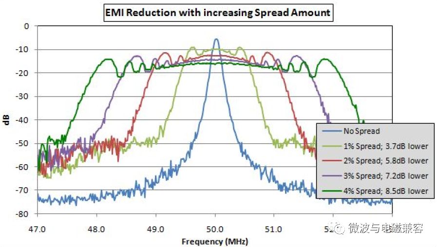 时钟展频有三个主要的控制参数:调制速度(Modulation Rate)、调制深度(Modulation Depth)和调制方式(Modulation Profile) 1. 调制速度 调制速度(MR)是指输出时钟频率 fo 在设定的调制频率范围内的变化速度。调制速度应远小于源时钟的频率 fc 以免引起时序问题(建立/保持时间等),同时应当高于人耳可识别的声音的频率范围(20Hz~20KHz)以免产生噪音。在实际应用中,调制速度一般选择30KHz~120KHz。 2. 调制深度 调制深度是指展频后输出时钟频率 fo 以调制速度MR偏移源时钟频率 fc 的大小。调制深度以偏移(Δf)源时钟频率的百分比(%)来表示。调制深度决定降低EMI峰值的大小。通常调制深度越大,EMI峰值越低。在应用时,需要合理预计系统可接受的频率调制范围。图2表示在不同调制深度下,EMI峰值的对比。 图2. 调制深度对降低EMI程度的影响 在许多系统中,基频的奇次谐波才是产生EMI问题的根源,SSCG不仅衰减基频的EMI辐射,同时也抑制奇次谐波上的能量辐射,而且相比于基频,SSCG对于奇次谐波的衰减作用更为显著。这是因为奇次谐波的(展频后)频带范围相比基频的频带更宽(整数倍)。如图3表征这种影响。 图3. EMI衰减 VS 奇次谐波 3. 调制方式 调制方式(Modulation Profile)决定EMI峰值的表现形式。Linear和Hershey Kiss是SSCG常用的两种调制方式。 线性调制相对简单,顾名思义,线性调制后输出的时钟频率是线性变化的。这种调制方法的缺点,如图4示,输出频谱旁瓣比中间频率幅度高1-2dB,如前文讨论,在任何频率EMI的失效也就意味着整个EMI测试的失败。旁瓣的辐射峰值可能超出SPEC范围,设计者需要考虑到这点的影响。 图4. 线性调制方式 & 输出频谱 通过Hershey Kiss调制可以得到接近平整的频谱图,如图5所示,Hershey Kiss调制的特点是在调制范围的两端,频率变化速度更快,在调制范围的中间值,频率变化较慢。频率在两端变化的速度快,这样信号在频率两端的能量得到更大的衰减,分散到中间位置。整体的表现就是整个频谱的能量近似平坦。图5中采用Hershey Kiss调制方式,EMI峰值更近一步衰减了1.13dB。