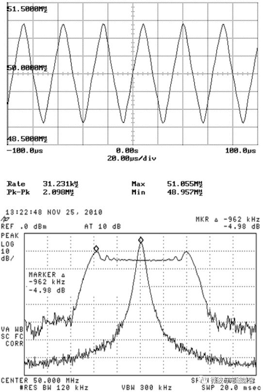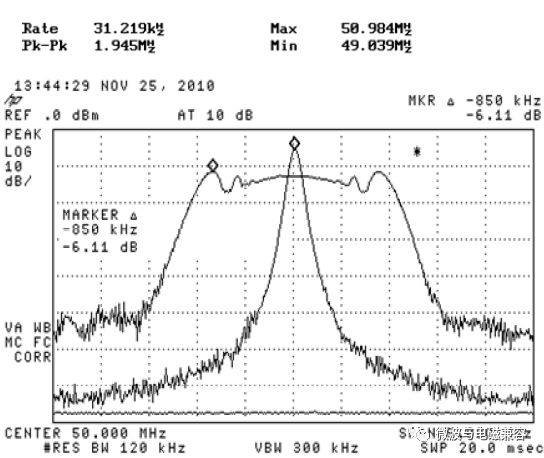 图5. Hershey Kiss调制方式 & 输出频谱 图6和图7是两种调制方式的频谱图。