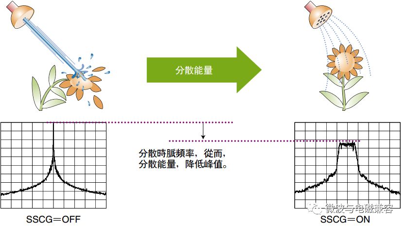 时钟展频通过频率调制的手段将集中在窄频带范围内的能量分散到设定的宽频带范围,通过降低时钟在基频和奇次谐波频率的幅度(能量),达到降低系统电磁辐射峰值的目的。 一般数字时钟有很高的Q值,即所有能量都集中在很窄的频率范围内,表现为相对较高的能量峰值。在频谱图上容易看到在中间频率上有很高的峰值,在奇次谐波位置有较低的峰值;SSCG通过增加时钟带宽的方法降低峰值能量,减小时钟的Q值。图1示意SSCG的工作原理。 图1. SSCG降低EMI示意图 时钟展频通过特定方式调制原始时钟信号。Linear和Hershey Kiss(不是好时之吻巧克力哦)是常用的调制方式。