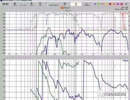 一个典型的分频系统相位校准(如上图快速傅里叶转换所示),其频段叠加部分函数情况往往不仅是因为时间差而存在的。回想一下,多少人误传着高频比低频跑得快,需要给高频做延迟来对齐相位的说法。而我们知道声音在空气中的速度是多少呢?331.5 m/s+0.6T,这是一个常量,从来没有过高频的声速,低频的声速的说法,因此应用延时对齐法,看似对齐了相位时间差,实际上却使得不同频段到达人耳的时间发生了先后的改变,尤其在多分频扩声系统中。甚至在很多时候延时法是无法完全对齐不同声源叠加部分的相位的,上图也即是一个典型的案例。