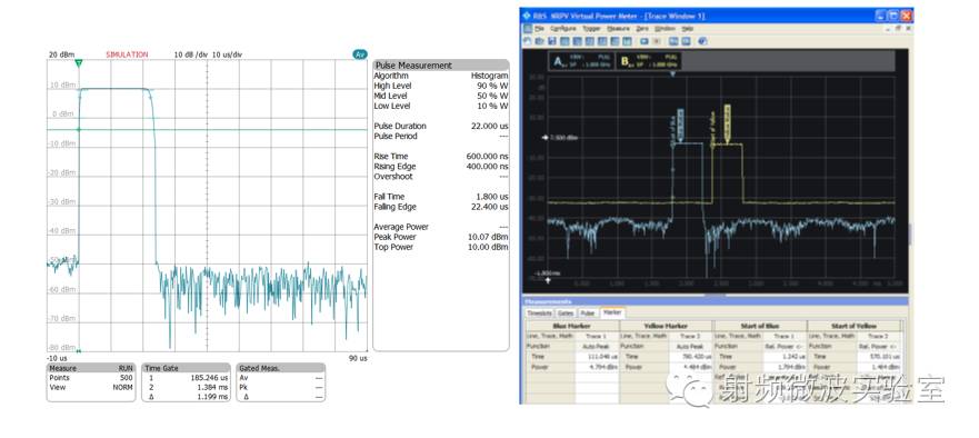 脉冲功率分析,通常的测试参数有功率参数和时间参数: 脉冲功率;脉内功率平坦度;上升沿过冲;脉内功率滑降。 脉宽和周期;脉冲重复频率;上升下降沿。 下图(左):单路信号脉冲功率测试;下图(右):两路信号脉冲功率测试,可分辨两路脉冲相对时间关系。